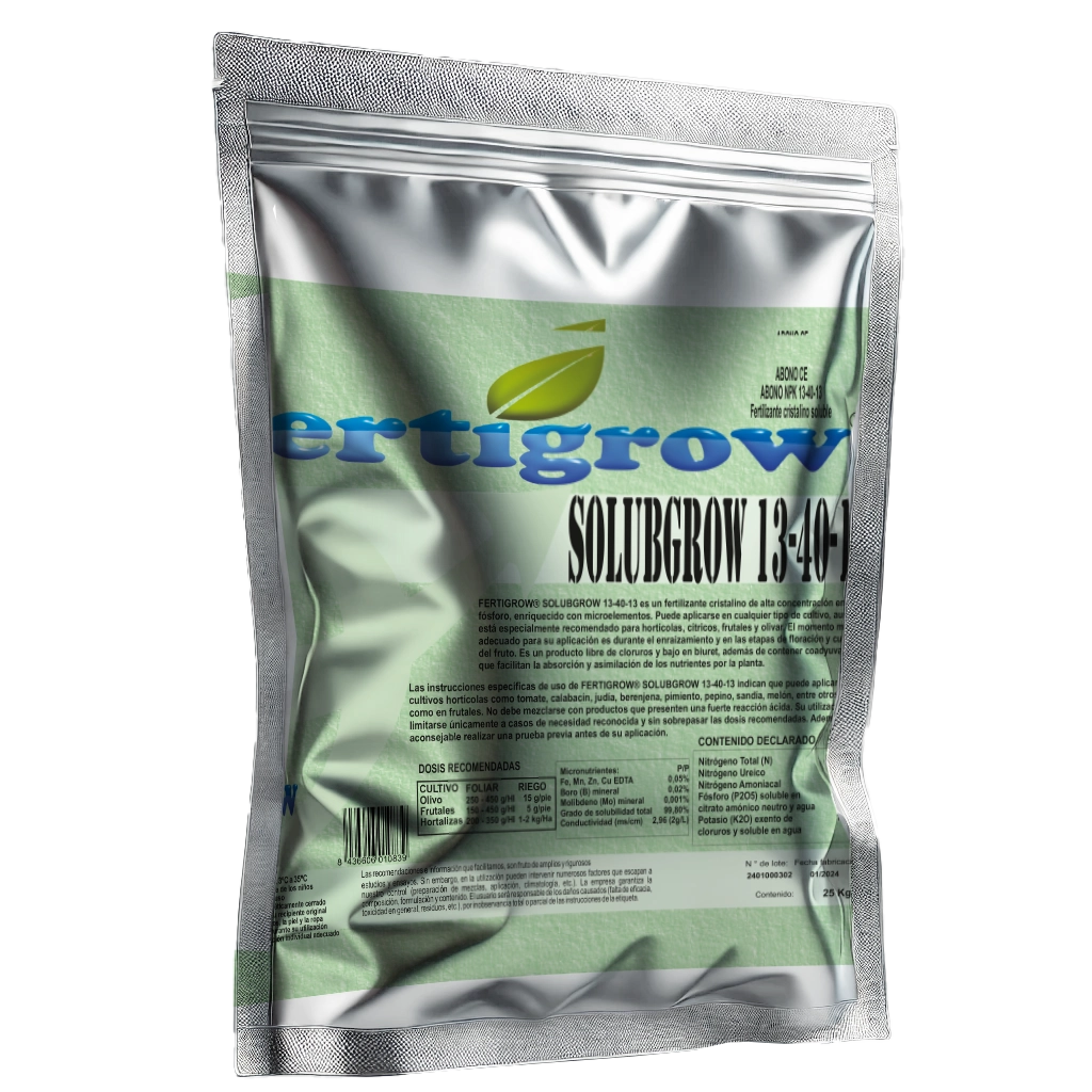 SOLUBGROW 13-40-13 es un fertilizante NPK en polvo soluble, formulado con alta concentración de fósforo (P₂O₅) para estimular el desarrollo radicular en los primeros estadios del cultivo y favorecer la floración y el cuajado del fruto en etapas posteriores.